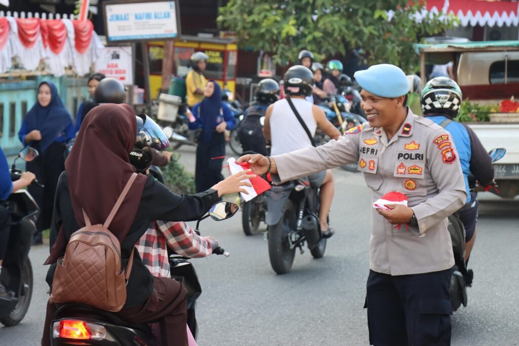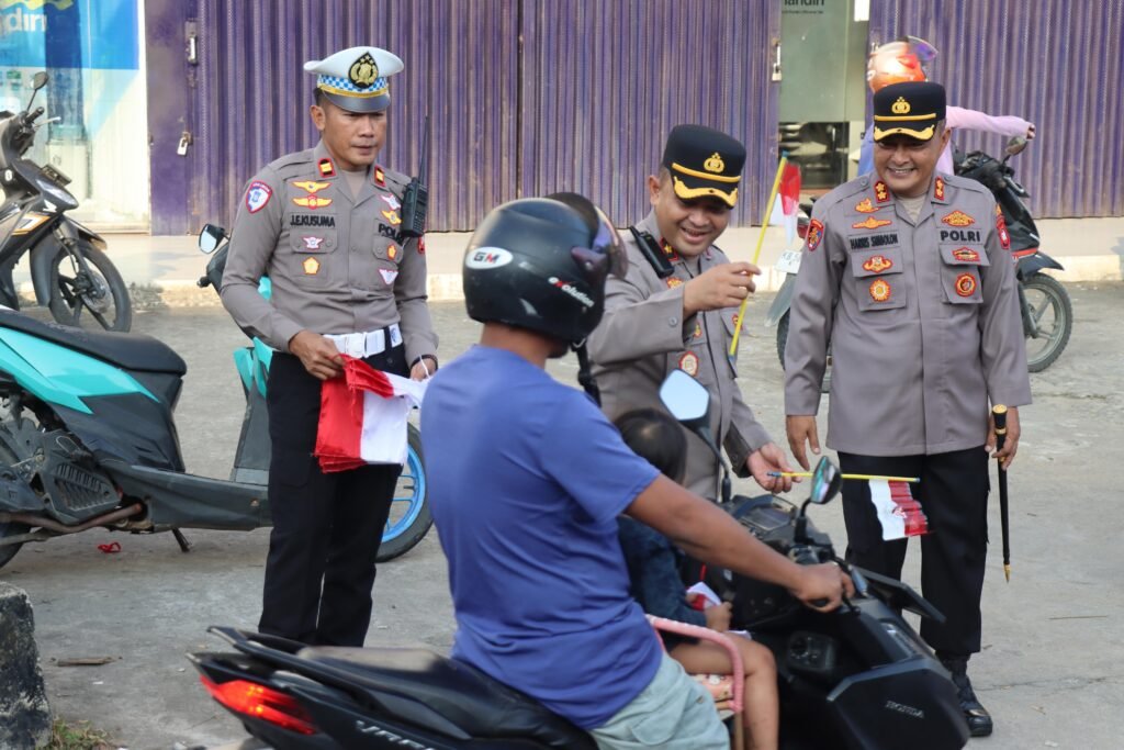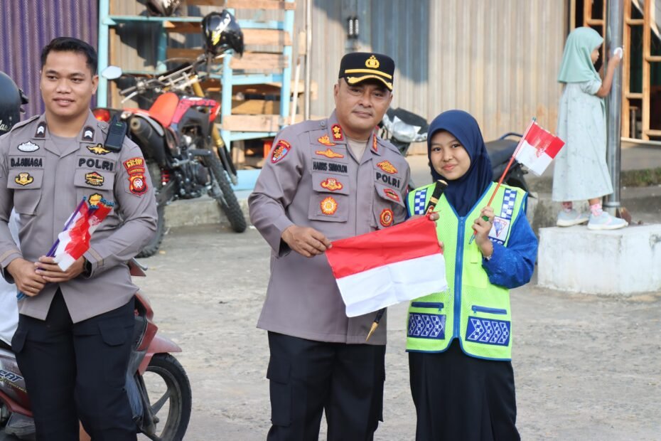 Polres Melawi | | DAYUNEWSTVINDONESIA.COM – Polda Kalbar – Menyambut Hari Kemerdekaan Republik Indonesia ke -80 tahun 2025, Kapolres Melawi Polda Kalbar AKBP Harris Batara Simbolon, S.I.K., S.H., M.Tr.Opsla pimpin langsung pembagian bendera di jalan Juang Km.1 tepatnya di depan SMP Negeri 1 Nanga Pinoh di dampingi Waka Polres Melawi Kompol Aang Permana, S.I.P., S.H., M.A.P, Pejabat Utama dan personel, Kamis (7/8)