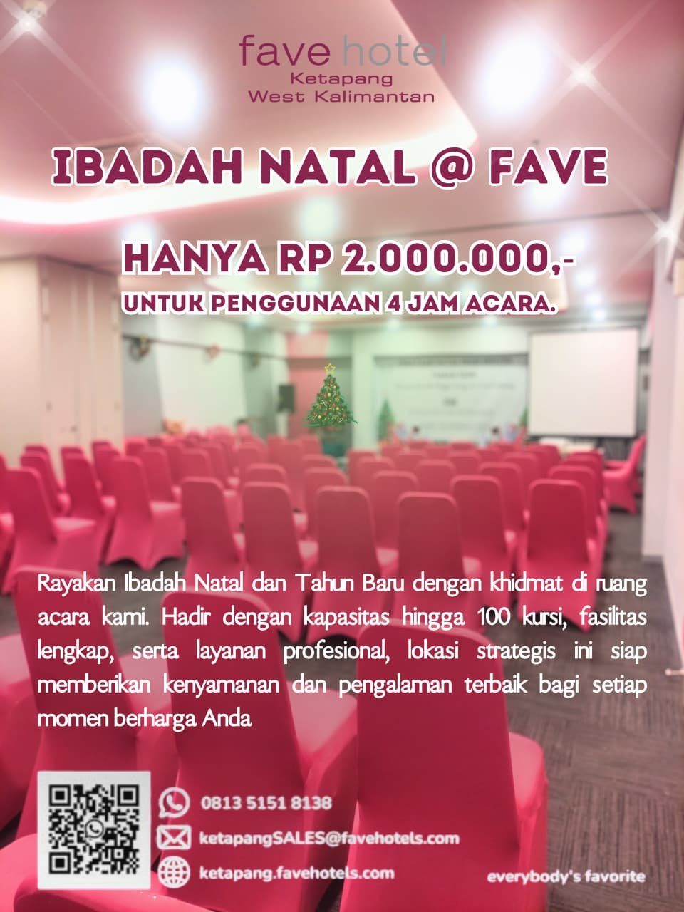 Ketapang,dayunewstvindonesia.com || – Menyambut Natal dan Tahun Baru 2025, Favehotel Ketapang, West Kalimantan, menawarkan paket spesial untuk perayaan ibadah umat Kristiani. Dengan hanya Rp 2.000.000, masyarakat sudah bisa menggunakan ruang acara eksklusif selama 4 jam penuh.