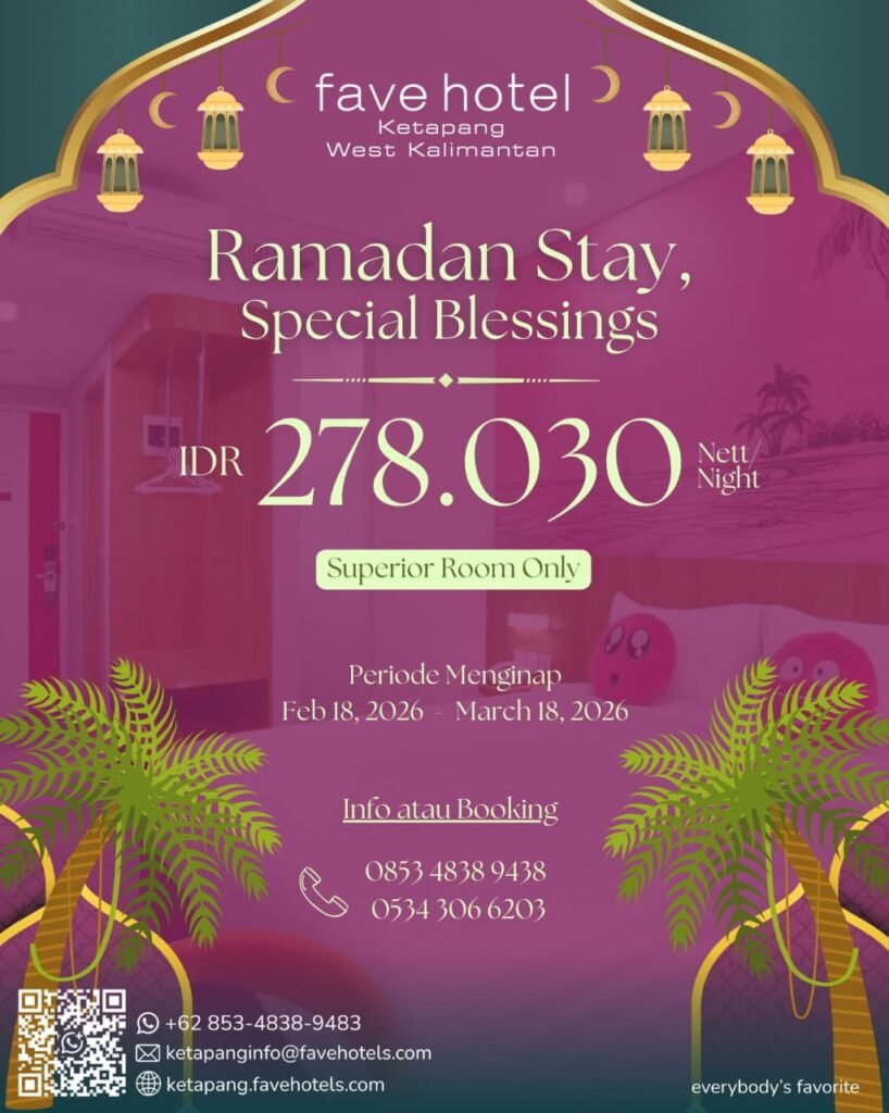 Ketapang DAYUNEWSTVINDONESIA.COM – Kalimantan Barat – Februari 2026 Dalam rangka menyambut bulan suci Ramadan, favehotel Ketapang menghadirkan promo spesial bertajuk “Ramadan Stay, Special Blessings” dengan harga mulai dari IDR 278.030 nett per malam untuk tipe Superior Room Only.
