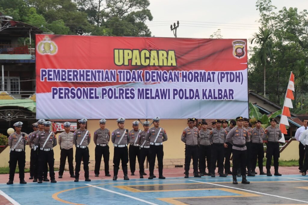 “Hari ini institusi Polri membuktikan implementasi ketegasannya dengan melakukan tindakan tegas kepada Bripka Yudi Mastanto personel Polres Melawi dengan merekomendasikan PTDH yang telah terbukti melakukan tindakan yang melanggar peraturan, norma norma etika dan disiplin anggota Polri serta pada fotonya kami berikan tanda silang,” ujar Kapolres Melawi.